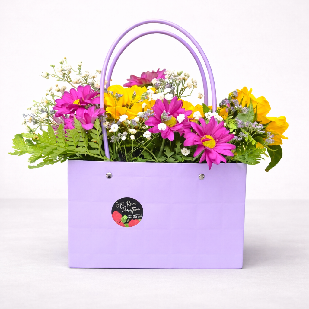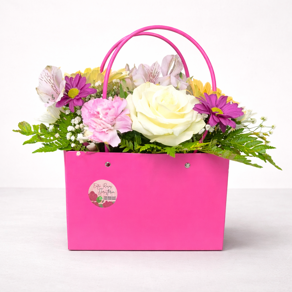 Un arreglo floral que expresa cariño, alegría y cercanía, presentado en una cartera elegante que simboliza un regalo que acompaña y permanece. Más que flores, es un mensaje que se entrega con intención.