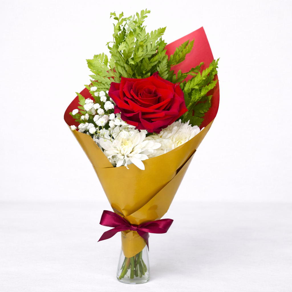 La rosa roja, protagonista del ramo, simboliza el amor verdadero, la pasión y la entrega, mientras que las flores blancas y el follaje verde representan pureza, equilibrio y esperanza. Cada elemento ha sido dispuesto de manera artesanal para transmitir un mensaje claro, delicado y auténtico.